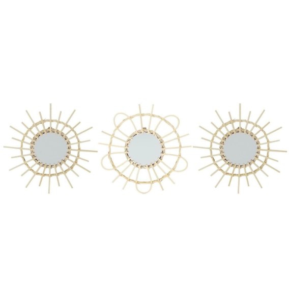 Zestaw trzech naturalnych luster rattanowych ożywi twoje wnętrze i doda mu letniej świeżości. Trzy różne lusterka o średnicy zwierciadła 10cm każde stworzą na ścianie niezwykły kolaż. W połączeniu z większymi lustrami taka instalacja wygląda niczym dzieło sztuki. Rattanowe lustra z ramą w naturalnym kolorze to dodatek rodem z egzotycznej wakacyjnej wyspy. Zdecyduj się na naturalną dekorację dzięki lustrom z rattanu. Skład: Rattan - Wymiary: 28x1,3x28cm Wymiary opakowania: 30,00 x 0,10 x 30,00cm