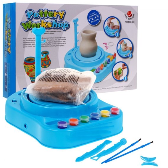 | - podstawa garncarska z kołem, - 2x narzędzia rzeźbiarskie, - stojak, - żyłka z uchwytami, - 6 różnych kolorów farbek, - 2 x pędzel, - 2 x glina razem 800 g |