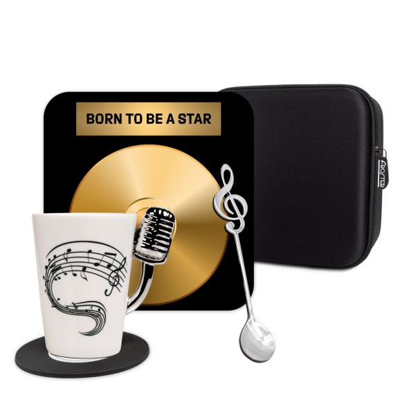 Zestaw "Born to Be a Star" to idealny prezent dla każdego miłośnika muzyki, który czuje się gwiazdą. W zestawie znajduje się elegancki kubek z motywem nut, który doskonale sprawdzi się podczas porannej kawy lub herbaty, oraz stylowa podkładka w kształcie płyty winylowej, nadająca całości wyjątkowego charakteru. Do tego dołączona jest łyżeczka z motywem muzycznym. Całość zapakowana w eleganckie, praktyczne etui, co czyni ten zestaw zarówno oryginalnym, jak i funkcjonalnym prezentem. Napis "Born to Be a Star" symbolizuje muzyczną pasję i gwiazdorskie ambicje, co czyni ten upominek doskonałym wyborem dla każdego, kto kocha muzykę i sceniczne emocje.