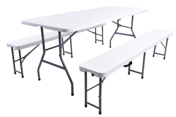 Komplet zawiera: stół cateringowy 180 cm i dwie ławki cateringowe 183 cm
