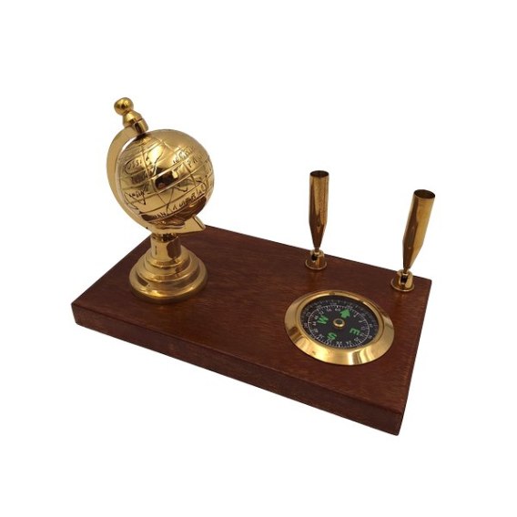 Elegancki zestaw dekoracyjny, który doda prestiżu każdemu wnętrzu. Składa się z miniaturowego globusa, stylizowanego kompasu oraz praktycznych uchwytów na długopisy. Wykonany z wysokiej jakości mosiądzu i drewna, zestaw będzie piękną ozdobą biurka w gabinecie, bibliotece lub pokoju młodzieżowym.