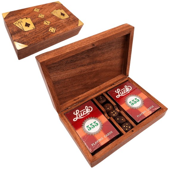 Zestaw do Gry - Dwie Talie Kart i Kości do Gry w Drewnianym Pudełku - Elegancki Prezent dla Gracza - DNU-008