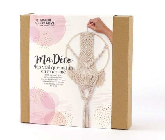 Makrama to znana od starożytności sztuka wiązania sznurków, która nie wymaga dodatkowych narzędzi i pozwala wykonać unikalne ozdoby. Zestaw do makramy zawiera: - kółko bambusowe o średnicy 25 cm, - 65 m sznurka bawełnianego o średnicy 2,5 mm, - instrukcję obrazkową krok po kroku. Nieodpowiednie dla dzieci w wieku poniżej 36 miesięcy. Orientacyjna wielkość po zrobieniu: 26x70 cm.