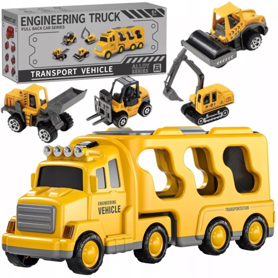 - Zestaw: 1 duża laweta i 4 pojazdy budowlane - wiele scenariuszy zabawy.