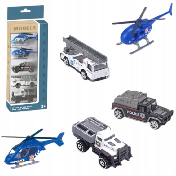Zestaw zawiera aż 5 różnych pojazdów po 2 helikoptery i 3 wozy w ładnychodcieniach z wzorem policyjnym to idealny prezent dla każdego dziecka, które chce pobawić się w policjanta czy przeprowadzić policyjną akcję Każdy pojazd jest inny. Zabawki zapewnią świetną zabawę na długi czas.