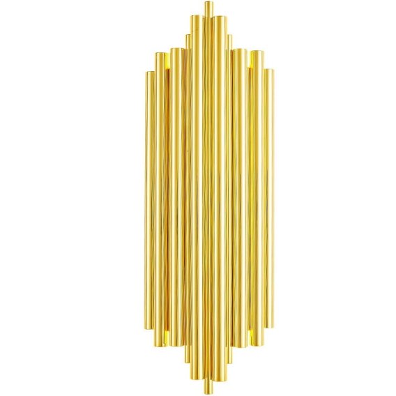 Kinkiet wykonany w całości ze złotej stali szczotkowanej, jest połączeniem złotych rurek, jest łatwy w montażu i pielęgnacji.